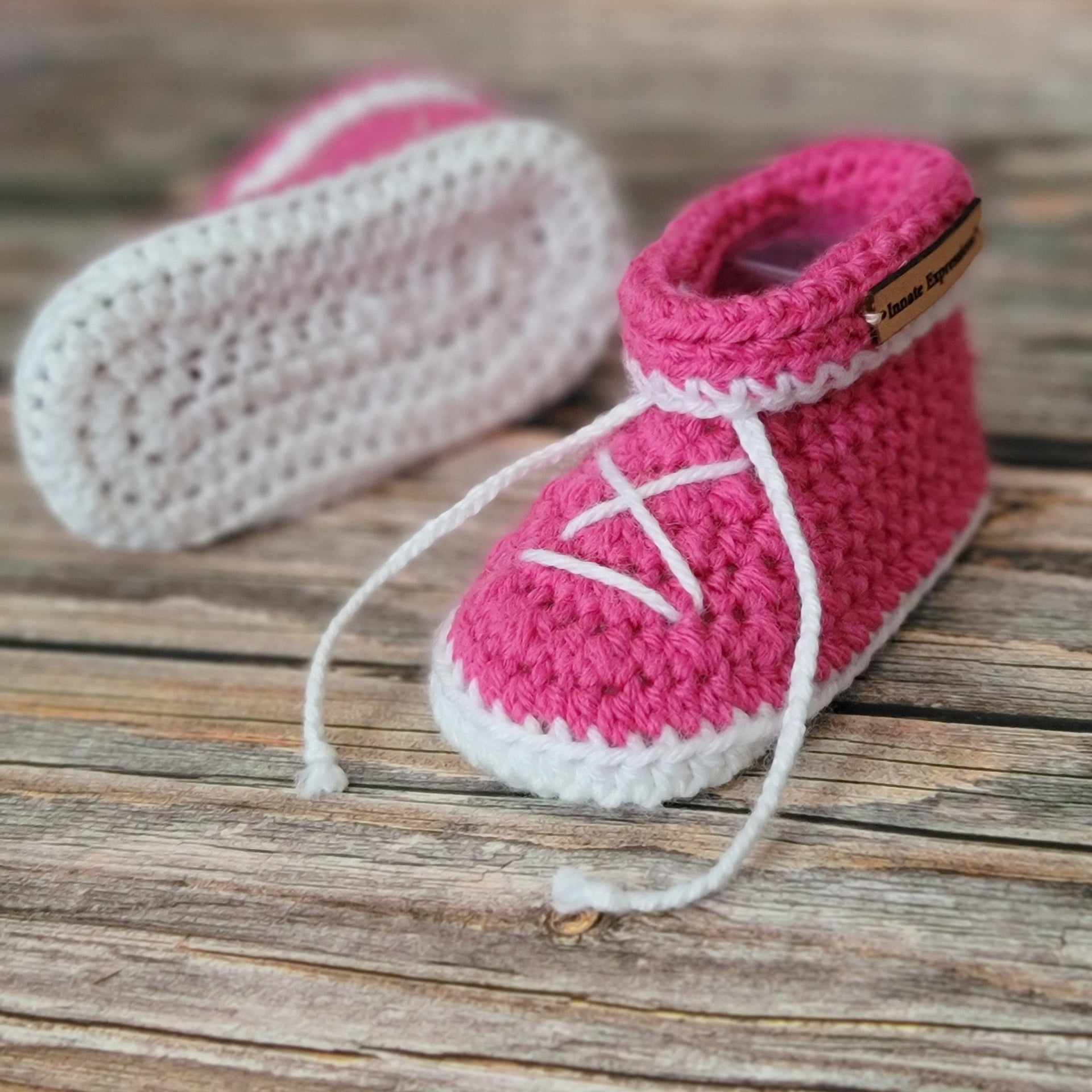 Note: To adjust booties around baby's ankle, lift cuff, tighten or loosen 'laces', refold cuff and tuck 'laces' to hide.