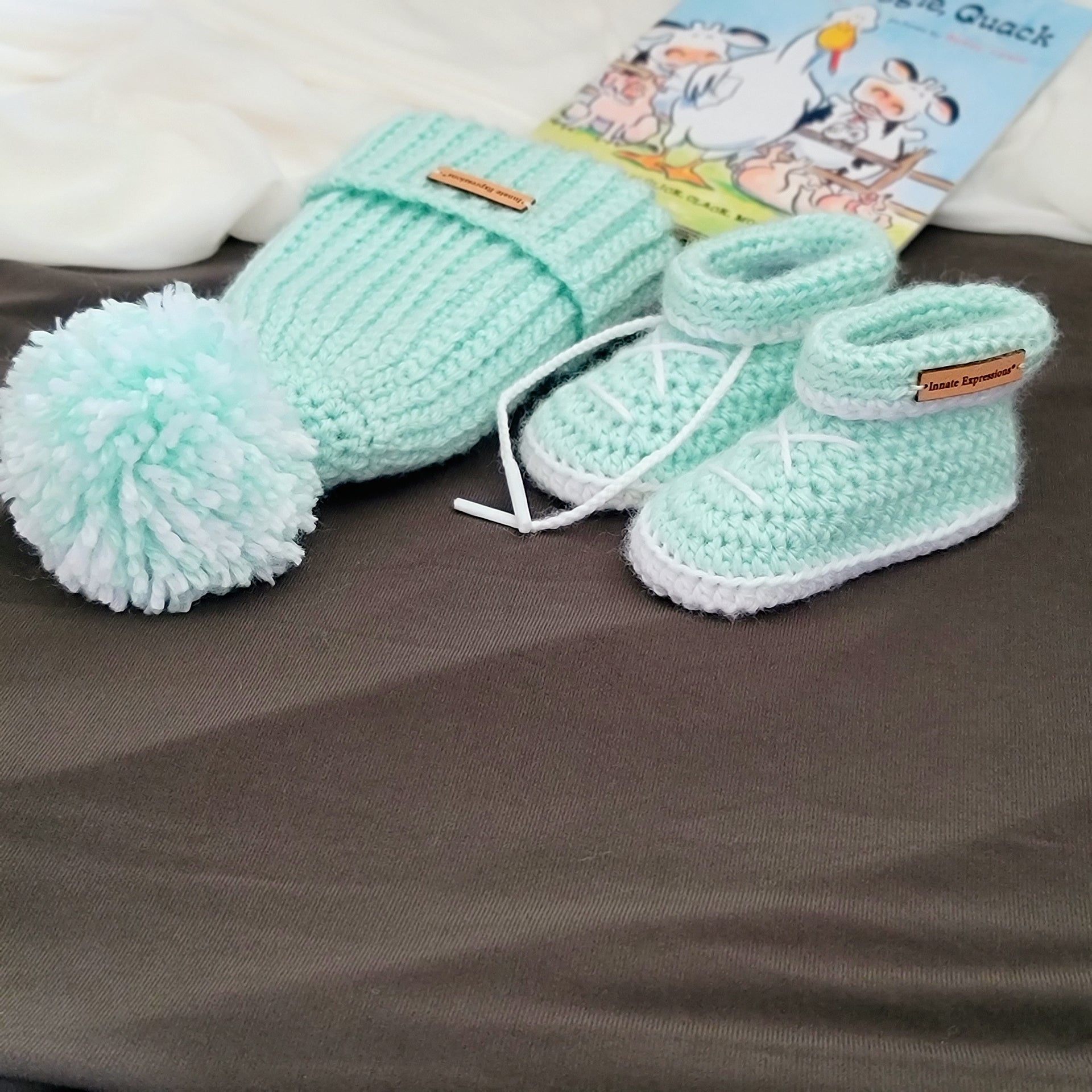 Bespoke Order: Peppermint Patty Baby Gift Set - Booties & Beanie - 3 to 6 months - Made to Order