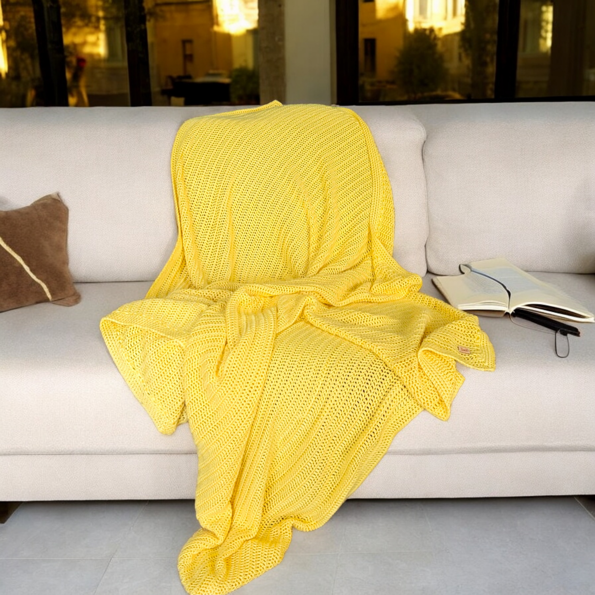 Every single stitch of the Monochrome throw has been meticulously handmade with love and care, ensuring a cozy and stylish addition to your home. The vibrant Sunshine Yellow hue brings a cheerful pop of color to any room, making it a perfect companion for those chilly evenings or a sunny accent for your decor.